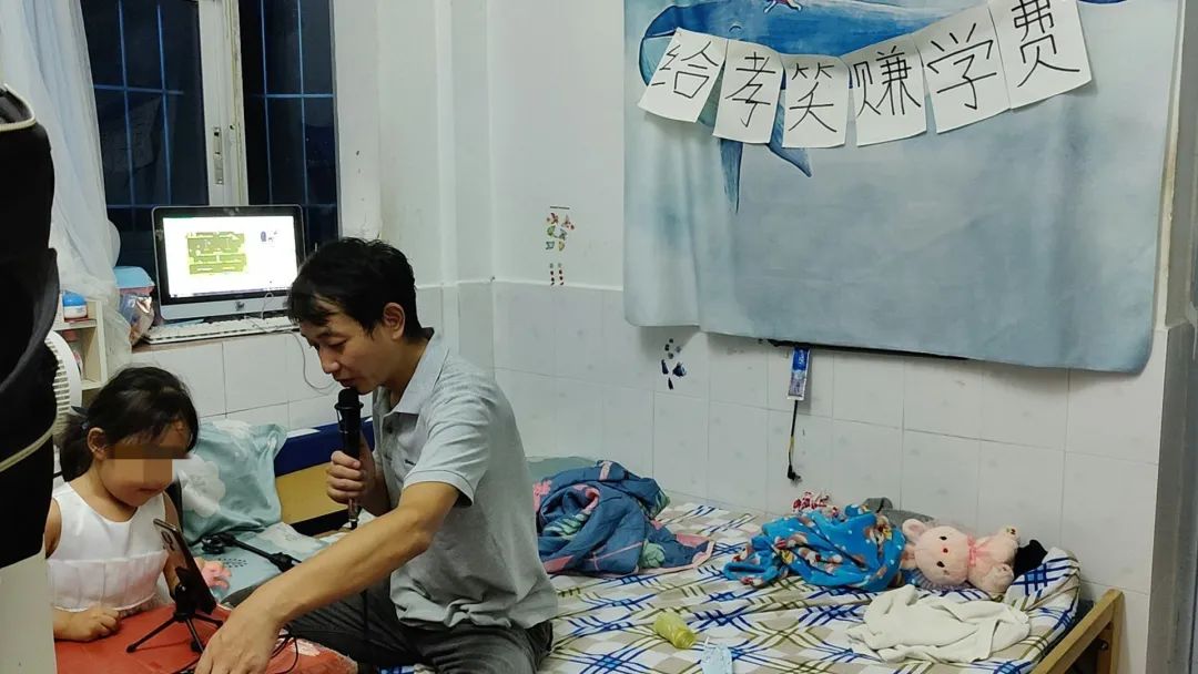 王友德和女儿住在新洲街上的城中村里,每月房租2000块钱。房子很小,一进门就能看到一张上下铺和一张木板床,它们占据了屋里大部分的空间。床边的墙壁上,贴着5张A4大小的白纸,上面用黑笔写着“给孝笑赚学费”几个字——这是王友德每天晚上直播时的背景墙。