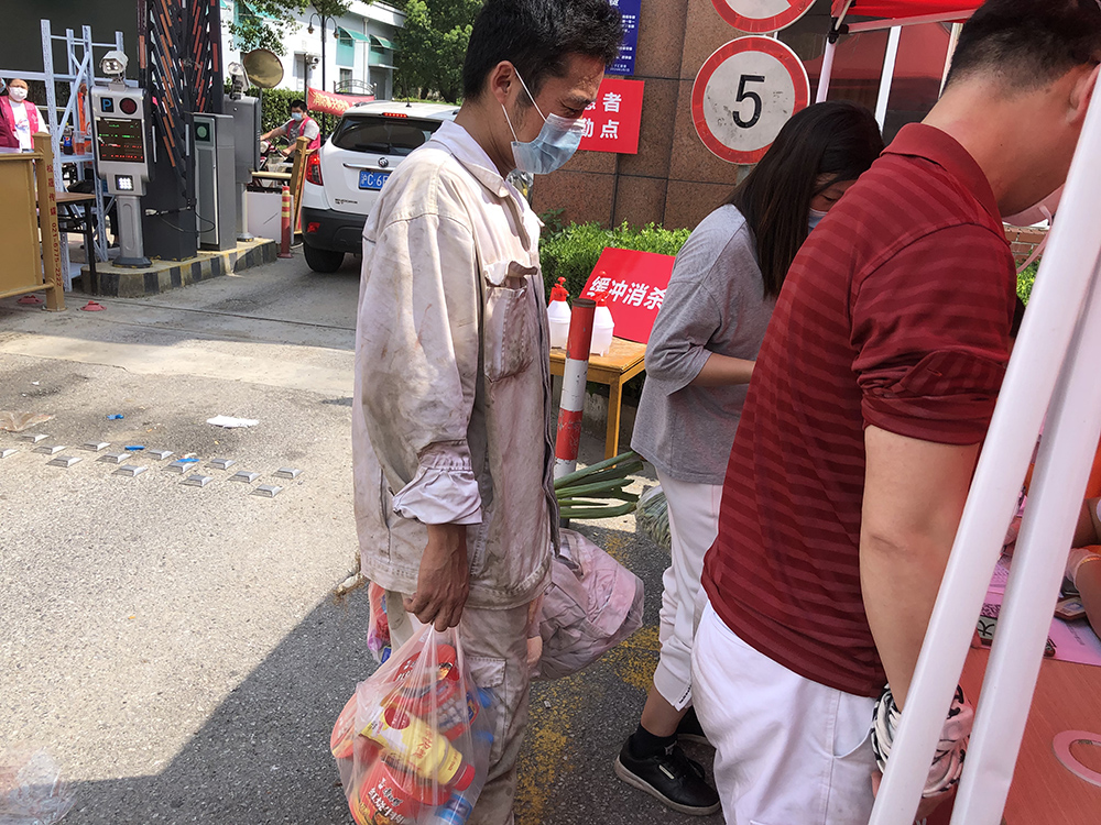 千汇苑一村小区租户周先生拎着一些方便面、饮用水,回小区隔离。