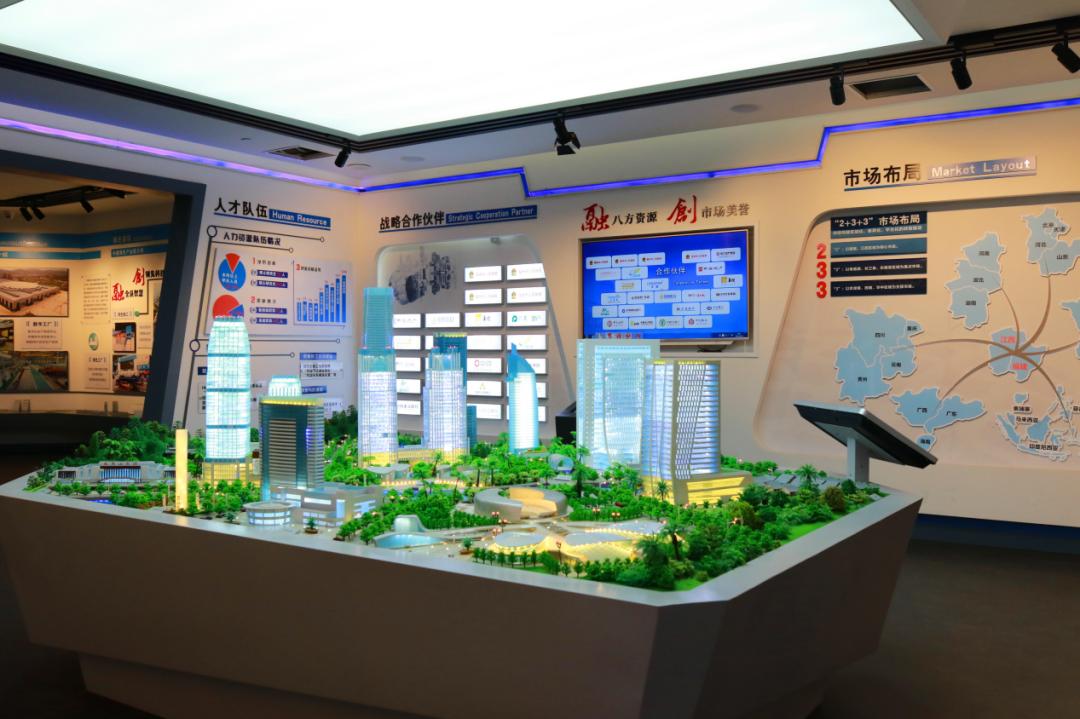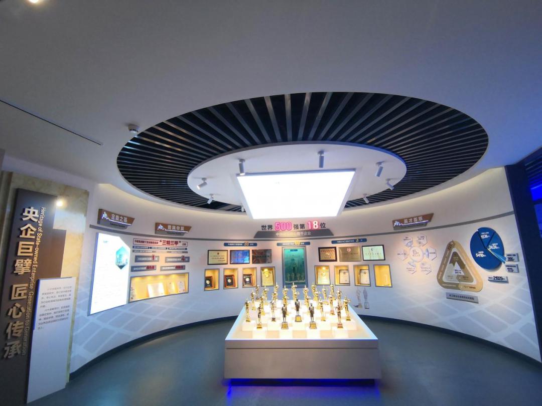 筑魂厅展示了企业荣誉、《军魂匠心》企业文化片、企业发展的重要历程、重大事件和经典故事,企业历程中的代表人物、珍贵文件资料、老物件,回顾部队时代的《基建工程兵之歌》,酒泉卫星发射中心的纪念盘,以及历年来企业文化建设取得的重要成果等。筑基厅展示了企业经营布局、分支机构、业务板块、产品系列等。9个精美模型展示了南京牛首山、杭州G20峰会主会场、全球十大绝美建筑北京丽泽SOHO等中建八局承建的精美建筑,通电玻璃橱窗里展现了八局投资建造的城市更新、水务环保等创新业务。沉浸式剧场通过立面245度环绕4K超高清液晶屏,满足人眼最大水平视角230度观影需求,地面超大LED地板屏,顶面镜面天花反射,采用5.1声道高保真立体环绕音响,打造出一个具有超震撼的剧场。全方位、更直观地感受全球海拔最低的五星级酒店-世茂深坑酒店的建造过程和建筑风采。