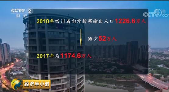 四川省2010年向外输出人口为1226.6万人,到2017年下降为1174.6万人,最大原因就是成都提供了更多的就业岗位,光是2017年从四川省内流入到成都市的常住人口就达到了46.6万人。