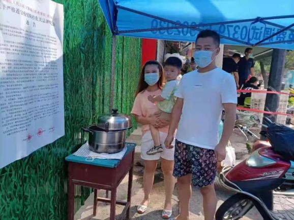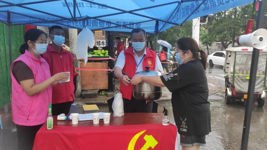 每天早上8:30左右,在东北隅街道办事处位于人民街与唐宫路交叉口的疫情防控卡点处,都能看到一位老太太端着不锈钢锅送到防控卡点,里面盛满了老太太一大早辛苦熬制的绿豆汤,她已然成为了防控卡点执勤人员的“老朋友”。