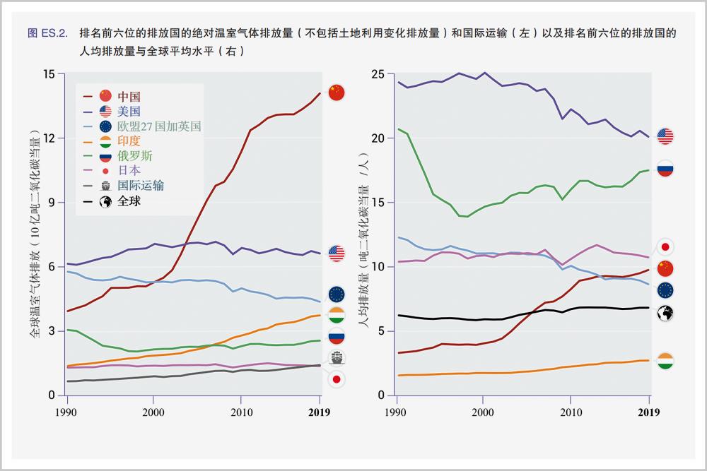 ▲全球温室气体排放总量及人均排放量来源:《2020年排放差距报告》联合国环境规划署