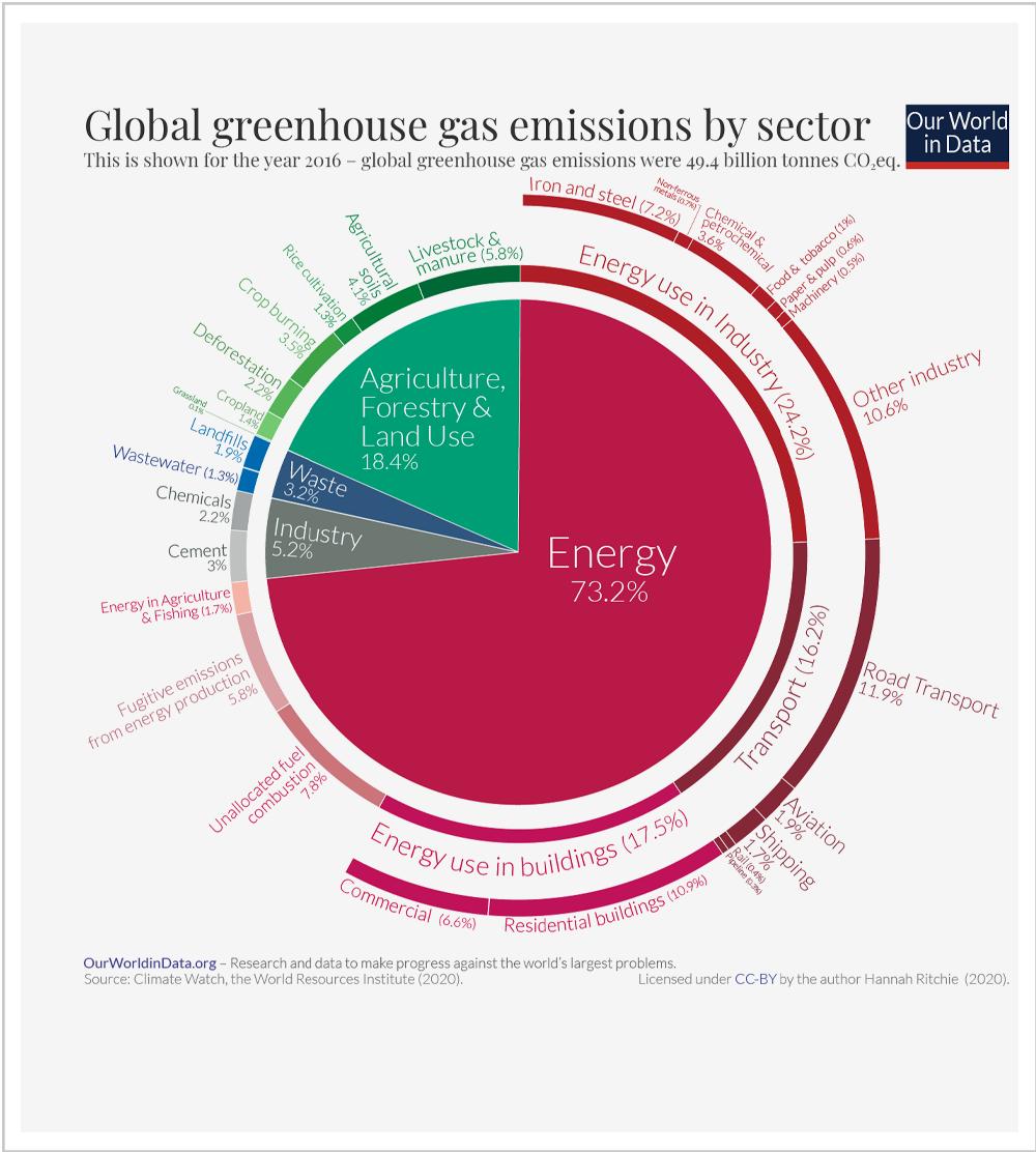 ▲全球温室气体排放按产业划分比例图来源:牛津大学 Our World in Data