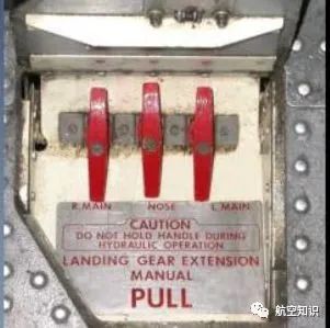 图:波音737手动起落架放出把手现代客机,起落架在液压系统不正常工作时也可依靠人工放出,拉动把手需40公斤左右的拉力,拉出后剩下的工作就交给重力了。