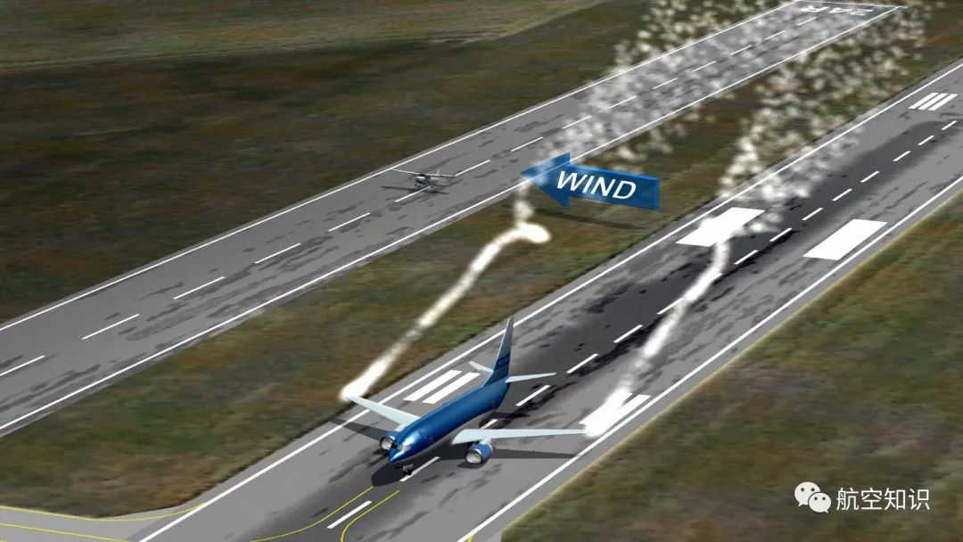 从飞机后方看,右侧的旋涡逆时针旋转,而左侧的旋涡顺时针旋转。旋涡中的气流一边旋转一边向后向下流动,其强度随着时间的流逝而减弱,尾流也同样会随着风向移动。