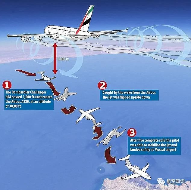2017年初,阿联酋航空的一架560吨重的A380在35000英尺的高度执飞迪拜至悉尼的航班时,自身强劲的尾流吹翻了1000英尺(约300米)下方对向而行的庞巴迪挑战者604公务机,导致后者在48秒内坠落了10000英尺(约3000米),单发失效后紧急迫降阿曼马斯喀特国际机场,强烈的颠簸导致公务机上的乘客均有不同程度的受伤,飞机也随后遭遇报废处理。