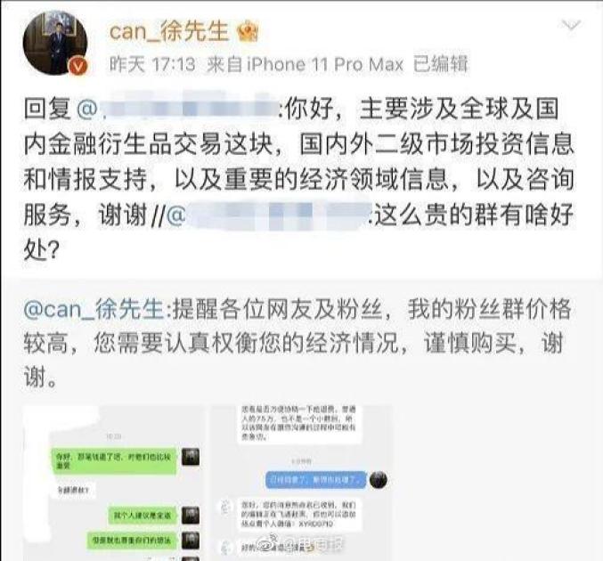 曾有网友问:“这么贵的群有啥好处?”徐勤根回答称,“主要涉及全球及国内金融衍生品交易这块,国内外二级市场投资信息和情报支持,以及重要的经济领域信息,以及咨询服务。”