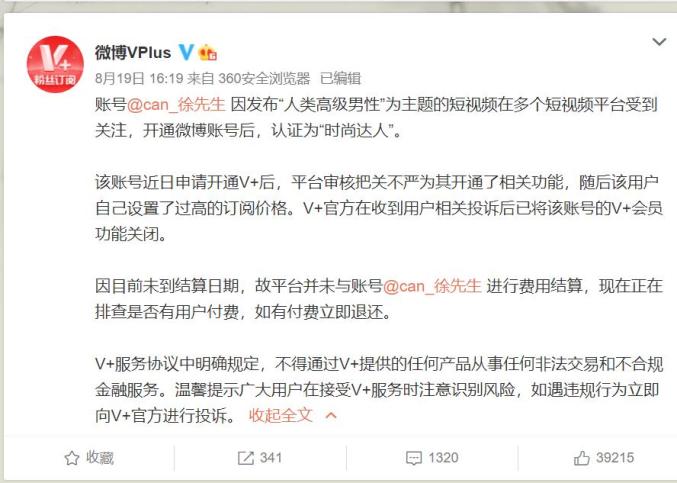 针对该微博用户这一行为,微博Vplus官方账号于8月20日发布回应称,账号@can_徐先生 近日申请开通V+后,平台审核把关不严为其开通了相关功能,随后该用户自己设置了过高的订阅价格。V+官方在收到用户相关投诉后已将该账号的V+会员功能关闭。因目前未到结算日期,故平台并未与账号@can_徐先生 进行费用结算,现在正在排查是否有用户付费,如有付费立即退还。