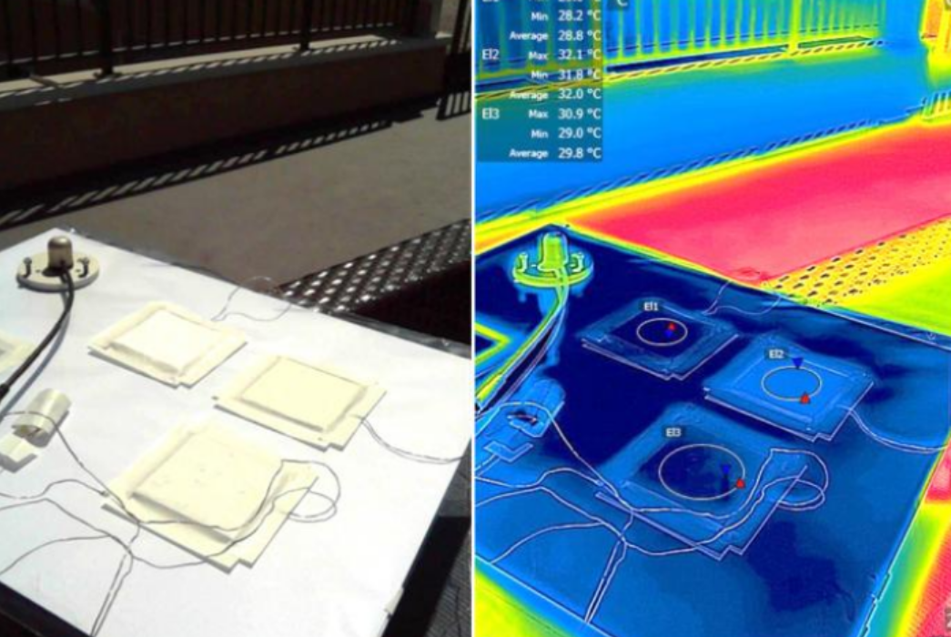 在正午阳光照射下,超白涂料(标记为EL1和EL3)比位于右上角的传统白涂料(标记为EL2)温度低得多。 来源 |《应用材料与界面》