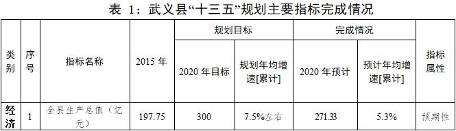 “十三五”时期是武义赶超发展、砥砺奋进,高水平全面建成小康社会决胜阶段。面对错综复杂的宏观环境、艰巨繁重的改革发展稳定任务和突如其来的新冠肺炎疫情影响,县委坚持以习近平新时代中国特色社会主义思想为指导,坚决贯彻中央和省委、市委各项决策部署,围绕“打造中国温泉名城、构建东方养生胜地”总体目标,深入实施“生态立县、工业强县、文旅富县、科创兴县”发展战略,全力做深做实“三篇文章”,团结带领全县人民拼搏实干、争先进位,走出了一条生态发展、绿色崛起的后发赶超之路。综合实力显著提升,“十三五”期间全县生产总值保持5.3%的年均增速,2020年全县生产总值、人均生产总值分别达到271.33亿元和74500元,一般公共预算收入达到27.45亿元。全县生产总值、人均生产总值、城乡居民可支配收入等全面小康核心指标较2010年翻了一番。百强县排名从2017年的229位上升至2020年的172位。产业结构不断优化,第一、二、三产业增加值占全县生产总值的比重由2015年的7.7:52.8:39.5调整为2020年的6.0:48.1:45.9,装备制造业入选全省优先培育特色产业集群,农业现代化水平居全市前列,创成省级全域旅游示范县、首批国家农村产业融合发展示范园、国家体育产业示范基地,成为全国首批“美丽中国·康养名城”。改革开放全面深化,区域联盟改革、建设用地赋能、“三个中心”集成改革等一批重大改革取得积极进展,山海协作、对口扶贫工作亮点纷呈,外贸出口居全市第三,入选全省首批国家级电子商务进农村综合示范县。都市区共建加快推进,S220改建段、义武公路、金武快速路建成通车;实施史上规模最大的旧城改造,三大安置区回建工程主体结顶;北岭新区建设加快步伐,温泉小镇创成4A级景区,建成高铁北站、会展中心、博物馆、城市展示馆等一批城市客厅,创成省级示范文明县城;美丽城镇、和美乡村建设卓有成效,荣获全省新时代美丽城镇建设优质县称号,列入国家县城新型城镇化建设示范名单。生态底色变得更亮,三次夺得“大禹鼎”,成功创建省级生态文明建设示范县,获评“中国天然氧吧”“全球绿色城市”。民生福祉持续改善,武义一中、县第一人民医院等一批重大民生项目落成投用,成功创建省教育基本现代化县,创成国家卫生县城,“双下沉、两提升”工作走在全省前列,“医联体+医共体”建设取得阶段性成效,社保、就业、医保、文化、体育等社会事业全面进步,城乡收入差距持续缩小,家庭人均年收入9000元以下贫困现象全部清零。社会治理创出特色,坚持和发展新时代“后陈经验”,平安武义、法治武义、清廉武义建设全面深化,省级平安县实现“十五连创”,勇夺全省首批一星“平安金鼎”。“十三五”规划目标任务顺利完成,高水平全面建成小康社会取得决定性成就,为开启高水平现代化新征程、打造“重要窗口”、推动跨越式发展打下了坚实基础。