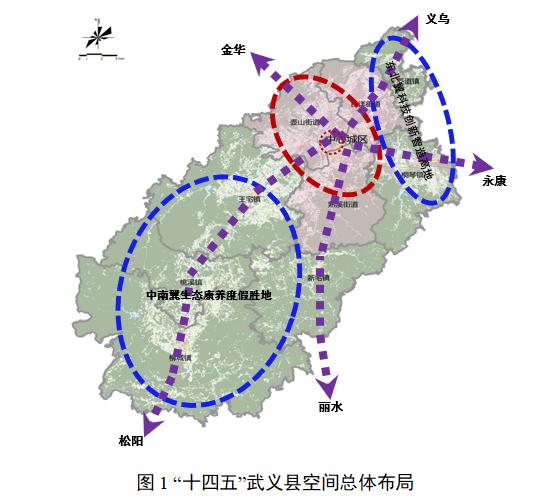 (六)“十四五”时期经济社会发展的空间布局坚持一体化、网络化、精细化、差异化、绿色化的空间布局导向,统筹人口、城镇、产业、资源要素和生态保护空间分布,推动发展战略与空间基地有机统一、空间战略与要素配置有效衔接,加快构建“一核集聚、两翼齐发、三轴联动、全域美丽”(一核两翼三轴全域)的县域空间总体布局,开启奋进武义新篇章。