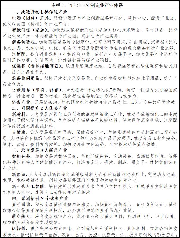 持续推动传统优势产业智能改造提升。以劳动密集型传统加工制造行业为重点,鼓励企业开展机器换人、自动换械、成套换台、智能换数,通过数字化车间和物联网工厂建设,推进“企业上云”向“深度用云”转变,加速传统产业全产业链、产业结构和产品科技含量提质增效。精准培育电动工具、杯业、门业、文旅休闲等八大重点细分行业样板,推动传统产业数字化、智能化、集群化、服务化发展。进一步提升经济开发区平台集聚效应和辐射带动作用,打造体系完整、特色鲜明、产业链完善的集群化生产基地。加快拓展“万亩千亿”产业平台,做大做强新材料、大健康等特色产业园,培育两大百亿产业。