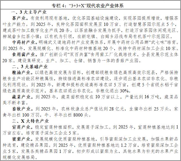 完善“3+3+X”现代农业产业体系。深化农业供给侧结构性改革,健全现代农业产业体系、生产体系、经营体系,着力提高农业现代化水平。做精茶叶、中药材、食用菌等3大主导农业,做好粮油、蔬菜、畜牧3大基础农业,做优宣莲、蜜梨等X大特色农业。深化国家农村产业融合发展示范园、省级现代农业园区、特色农业强镇建设,推进农业与文化、旅游、教育、康养等产业互融互促,不断丰富新经济新业态,加快形成全产业美丽生态经济。推进共享田园建设,推动田园生态共享、资源共享、产业共享、平台共享、利益共享,打造美丽田园升级版。
