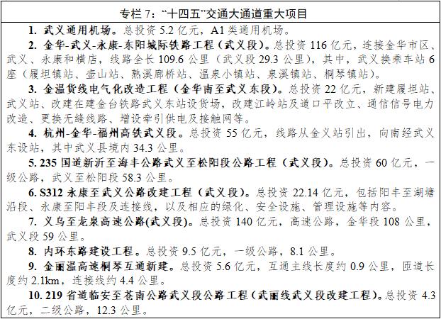加快构建“二环三纵九横”综合交通格局。抢抓金华全国性综合交通枢纽建设机遇,以串联台武黄、杭武龙为重点,拓展对外连接网,重点推进金温货线武义段外迁、义龙高速、G235武义至松阳段、S219临安至苍南公路、S312永武公路改建等工程,谋划建设建德至武义高速公路、S316三门至江山公路以及金武永东城际铁路、金台城际铁路、金龙城际铁路、杭金福高铁等项目,加快推进武义A1类通用机场建设。织密内部贯通网,加强以内环东路、永武二线、内环西路、萤乡路为界的内环和以永武四线、泉深线、永武三线、新上松线为界的外环交通线建设。研究谋划武义江航道等级提升、港口作业区建设项目,推动武义水运发展。