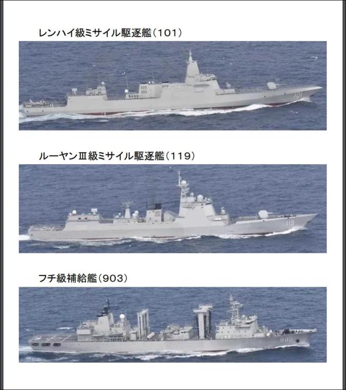 统合幕僚监部截图中国海军舰艇编队由052D型驱逐舰119“贵阳”舰,055型驱逐舰101“南昌”舰,903a型综合补给舰903舰共3艘军舰组成。这三艘舰艇随后通过对马海峡北上进入日本海。