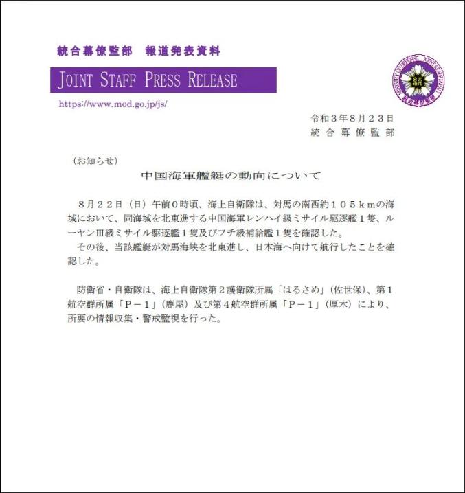 日本自卫队统合幕僚监部8月23日消息,8月22日凌晨0点左右,日本海上自卫队在对马岛西南方向约105公里的海域,发现了正向东北航行的中国海军舰艇编队。