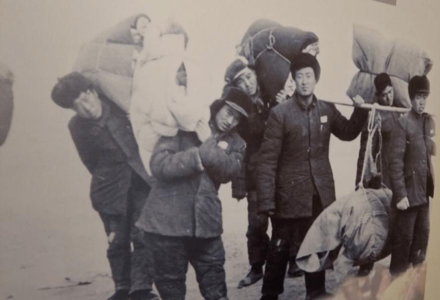 从全国选调的科研技术人员扛着行李走进戈壁深处
