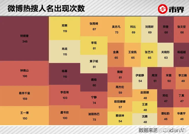 程序员CoderW统计了2020年的35901条微博热搜数据,热搜次数最多的40个人里大部分都是娱乐圈人士。比如,因涉嫌强奸罪被批捕的吴亦凡出现过73次,肖战出现过115次,郑爽出现过119次。