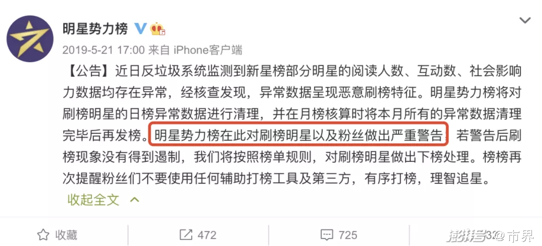 于是耐人寻味的情况出现了:一方面,排行榜的存在诱导粉丝进行打榜,来为喜欢的艺人偶像争取资源。另一方面,微博警告明星和粉丝不要刷榜。于是最终的结果是,势力榜刷榜从没断绝,微博还与粉丝发生摩擦。