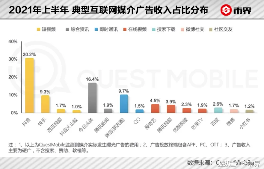 据QuestMobile发布的2021年上半年报告,主要以硬广投放做统计的话,在典型互联网媒介的广告收入分布上,抖音占比达到30.2%,微博占比仅为1.7%。