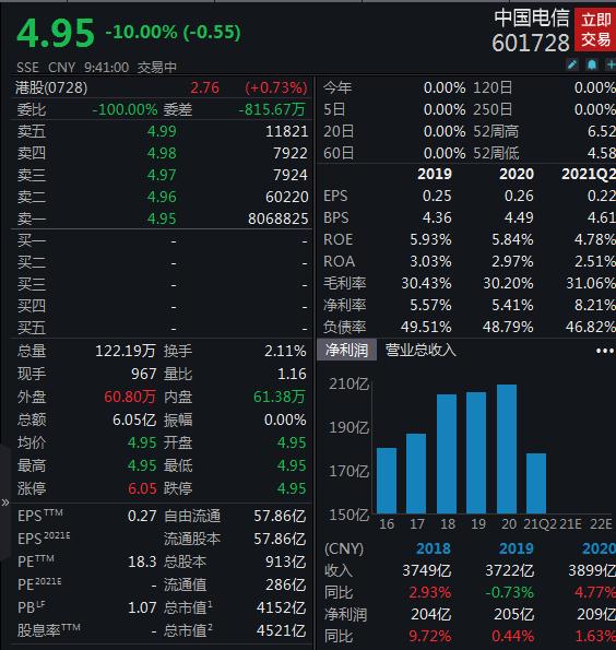 如果中国电信明日继续跌停,跌停价将低于4.53元的发行价。涨停、跌停、再跌停……回A上市以来,“巨无霸”中国电信股价走势上演了“惊天”反转戏码。8月23日,中国电信A股开盘跌停。截至收盘,跌停板封单高达1003万手,想要出逃的资金规模超过55亿元。