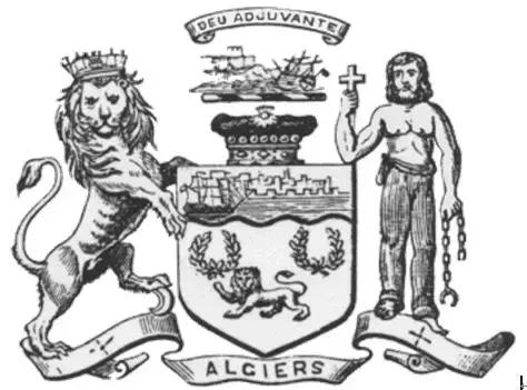 爱德华-佩洛子爵的纹章,右边有一个挣脱锁链的奴隶,中央是英国海军进攻阿尔及尔的场景。