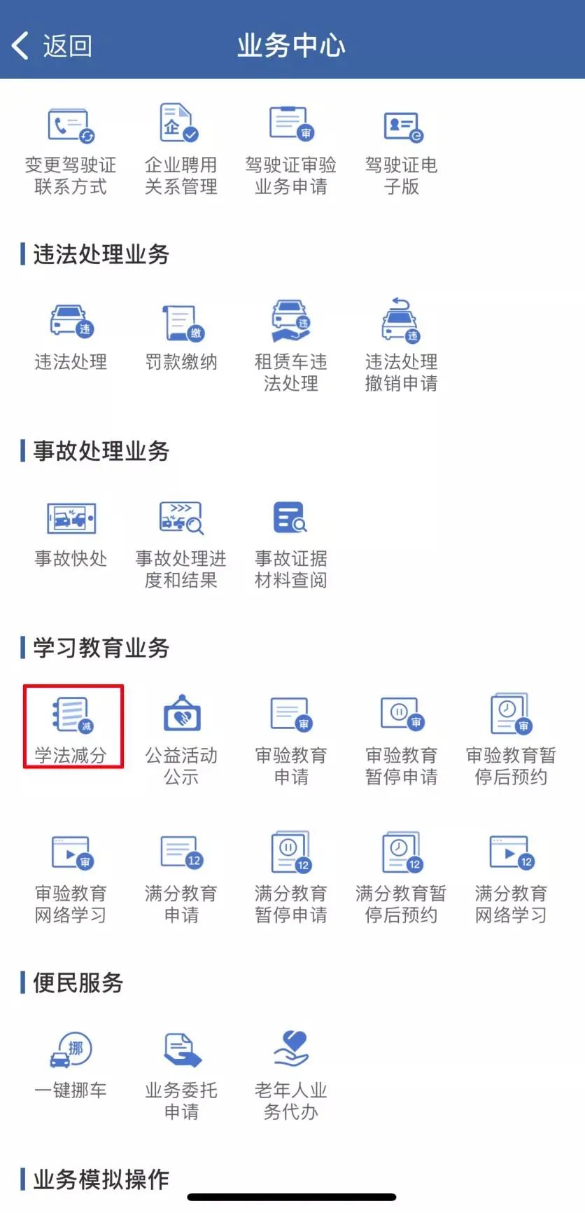 1.驾驶人首先需下载“交管12123”APP,注册登录后点击首页业务功能,选择【学习教育业务】模块下->【学法减分】按钮,进入学法减分申请页面。