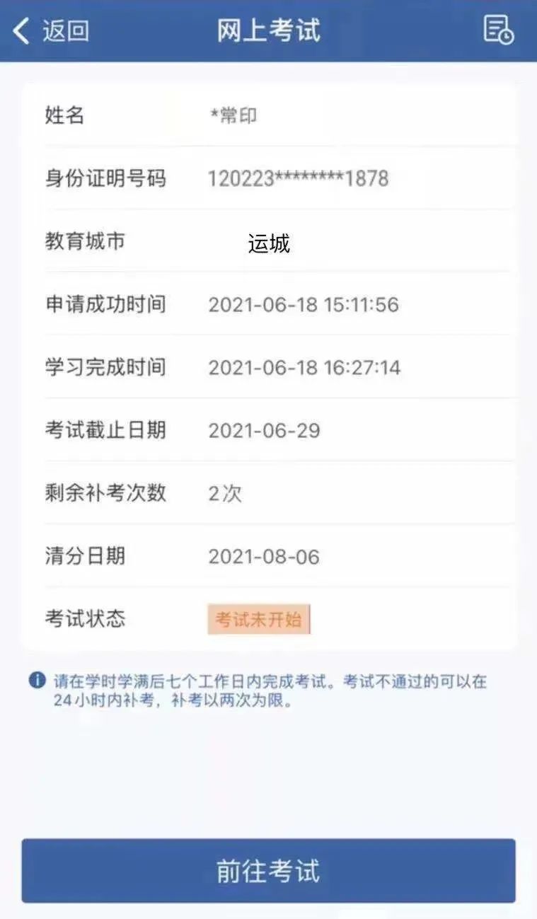 学法减分考试1.已完成学习的,驾驶人用户点击【学法减分】按钮,在已经完成学习的情况下,点击【前往考试】进入考试,如之前考试没通过且剩余考试次数还有的情况下,可点击【前往补考】进入补考。
