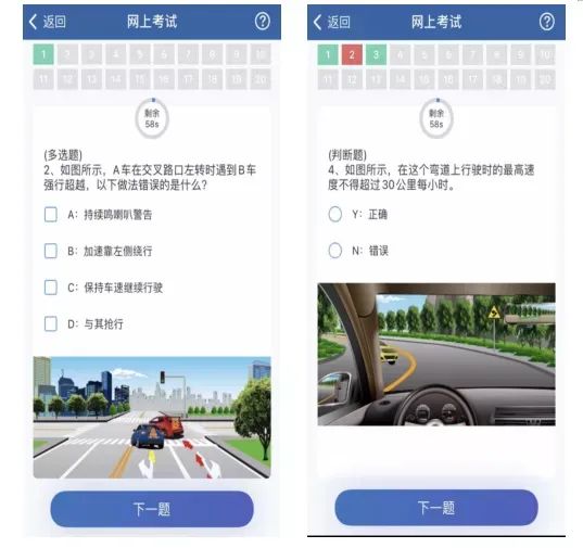3.系统随机抽取20道试题,每题限时答题时间60秒,如在倒计时内未完成答题,则系统判断为该题目未答,右上角问号按钮弹框提示用户考试规则。