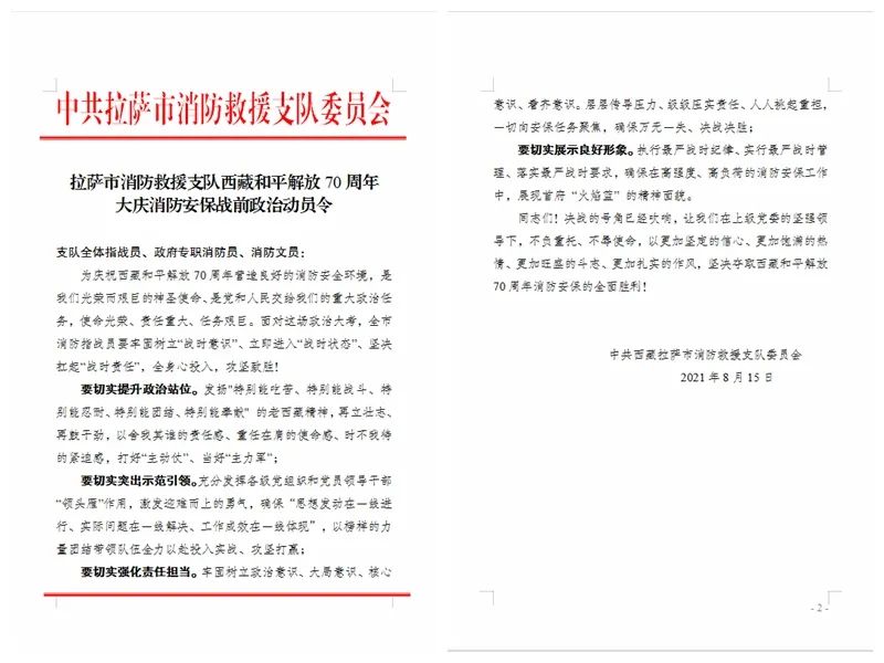 为强化党员意识,充分发挥党员先锋模范作用,让党旗在勤务安保一线高高飘扬,支队党委第一时间向全体指战员发出《拉萨市消防救援支队西藏和平解放70周年大庆消防安保战前政治动员令》。