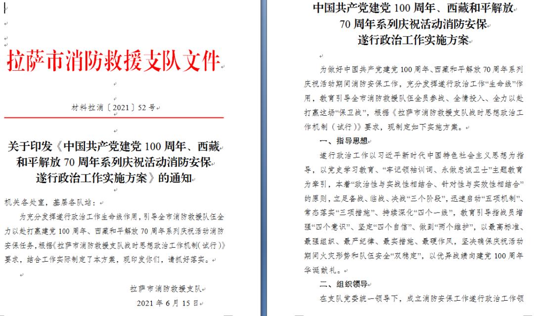 支队根据工作实际制定出台《中国共产党建党100周年、西藏和平解放70周年系列庆祝活动消防安保遂行政治工作实施方案》。