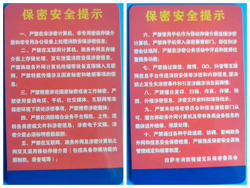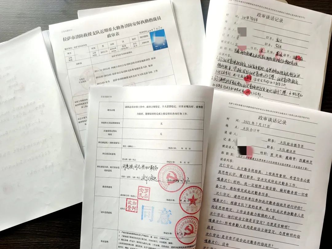 针对所有核心区勤务点,创新实施勤务前车辆装备器材点验封存制度,派出4个工作组,根据核心区勤务点部署情况,及时跟进开展车辆装备器材点验工作,大庆消防安保勤务期间,共封存车辆28台次、张贴特制封条163张,点验保管参勤指战员的火机、香烟、手机等个人物品108件,开展勤务前集体谈话12次,坚决避免夹带不安全隐患上勤,工作模式和成效得到了上级领导的充分认可;同时,以“强作风、严纪律、迎大庆”作风纪教育整顿活动为契机,主动对接拉萨市禁毒委员会在全区队伍中率先开展禁毒宣传及指战员毒品尿检工作,提高全市指战员识毒、防毒、拒毒能力。积极对接公安机关对全市684名勤务人员开展政治审查工作,层层组织签订重大消防安保工作责任书、承诺书;邀请国家安全机关开展形势任务教育,引导指战员牢固树立爱国主义精神、国家利益至上观念、法纪观念、敌情观念、保密观念和安全防范观念,确保指战员始终信念坚定、站位牢靠,切实推动消防安保各项工作落实。往 期 精 彩