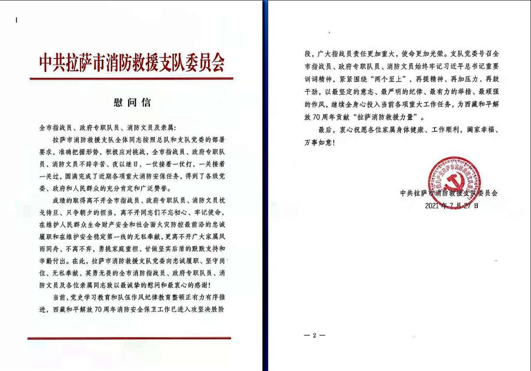 为传递党委关怀,保证指战员思想稳定,争取家属对消防工作的支持,确保队伍始终保持强大的凝聚力和旺盛的战斗力,支队党委在勤务安保工作进入决战决胜阶段时给全市消防救援指战员家属寄发了慰问信,对指战员家属在近期重大消防安保勤务期间默默付出,不遗余力地的支持消防工作表示感谢,勉励家属同指战员一道同心同德、群策群力,确保庆祝活动消防安保万无一失;同时,支队党委坚持为基层办实事原则,全体班子成员深入基层慰问一线指战员,看望慰问家庭生活困难指战员,帮助指战员解决各类困难诉求,为38名指战员申办夫妻分居生活补助。04