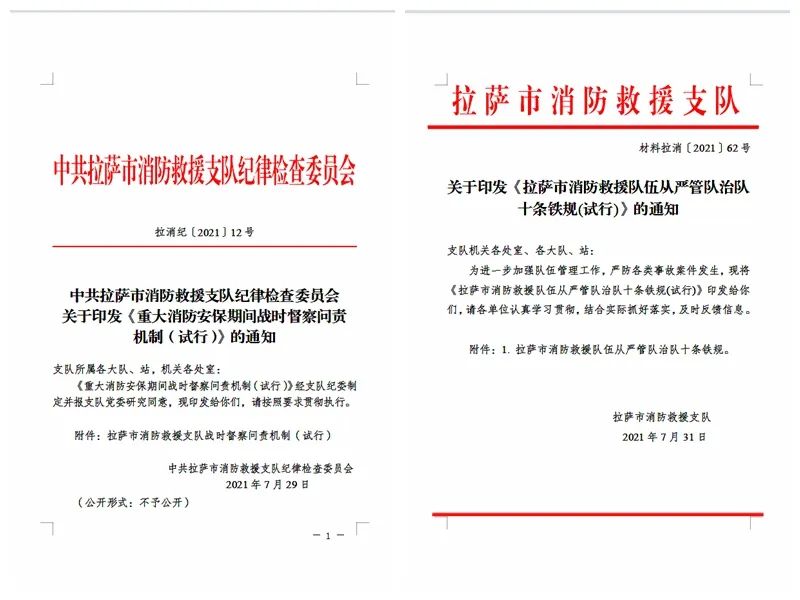 支队第一时间研究出台《拉萨市消防救援支队重大消防安保期间战时督察问责机制》,下发《拉萨市消防救援队伍从严管队治队十条铁规》,并结合实际制定了西藏和平解放70周消防安保常态化和专项督导检查方案各1份,深入开展队伍内部督导检查,以“细致、精致、极致”的工作标准,重点对执勤形象、基层安保方案、应急处置预案、任务清单、责任清单制定落实情况等方式开展政治监督,实地督导单位和执勤点16次,视频抽查单位10次,发现问题13处,要求立行立改13项,坚决防止消极应付、措施不力、敷衍塞责、行动迟缓等形式主义、官僚主义行为发生,对违反战时纪律的坚决做到“有责必究、问责必严”,为消防安保工作提供了坚强的纪律保障。启动战时干部考察识别程序
