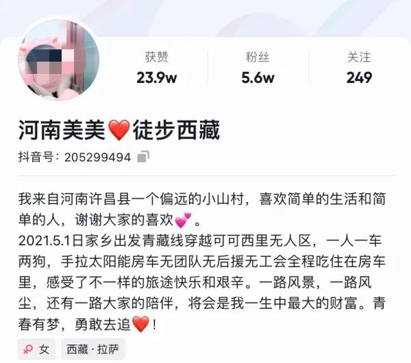 “一片大地,盖上喜欢的房子,种上粮食瓜果蔬菜,鸡鸭鹅奶牛,救助流浪狗,还有敬老院,单纯不违心,这是我的理想。”7月3日,在徒步西藏的第60天,抖音博主“河南美美 徒步西藏”用一段视频记录下了她当时的心境。