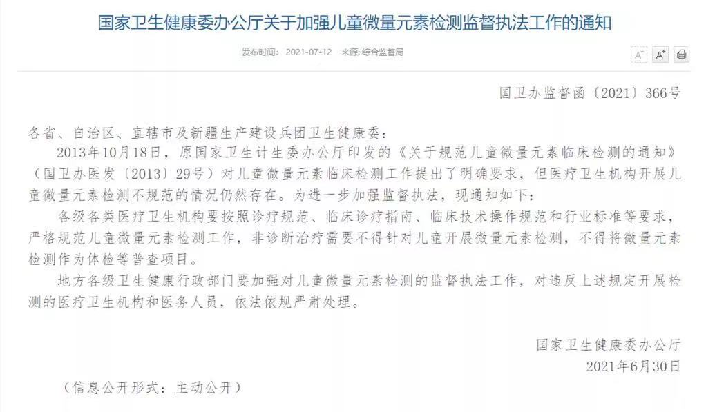 近期的《通知》又明确要求,非诊断治疗需要不得针对儿童开展微量元素检测。用词从“不宜”变成了“不得”。