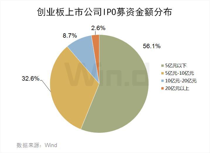 Wind数据显示,截至8月24日,1013家创业板公司累计IPO募集资金5745.41亿元,平均单家公司IPO募资5.68亿元,超过半数的上市公司IPO募集金额在5亿元以内。