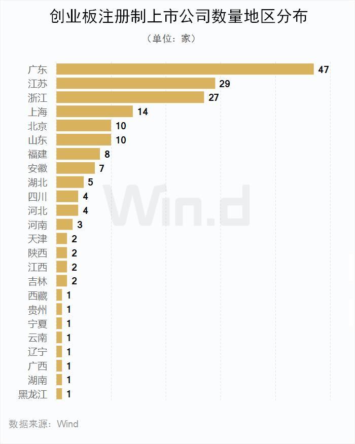 地域分布方面,广东、江苏和浙江三个省份数量稳居前三,合计占比过半,具体家数分别为47家、29家、27家,合计占注册制下公司家数的56%。