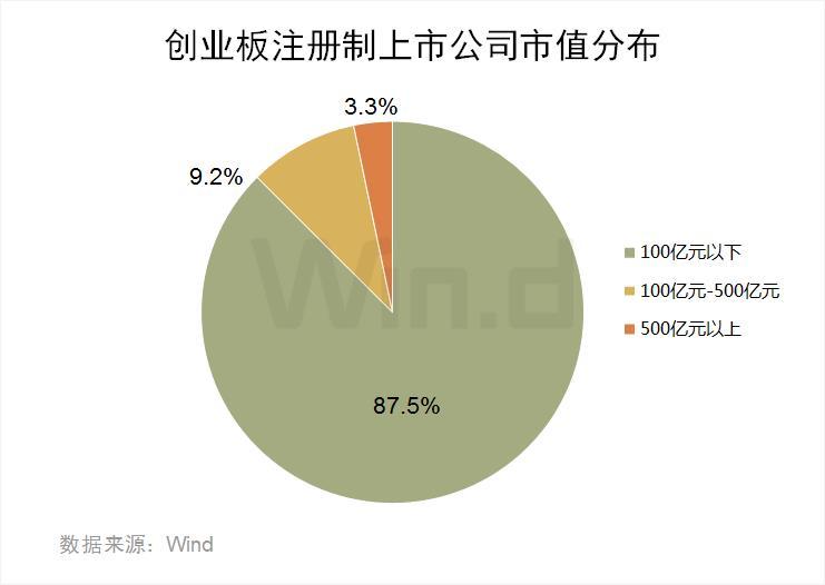 在市值分布上,创业板1013家上市公司中,市值在100亿元以内的上市公司787家,占比78%;市值在100亿~500亿元的190家,占比19%;市值在500亿元以上的36家,占比3.6%。