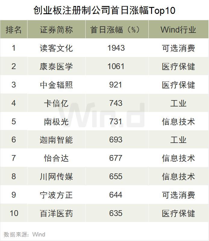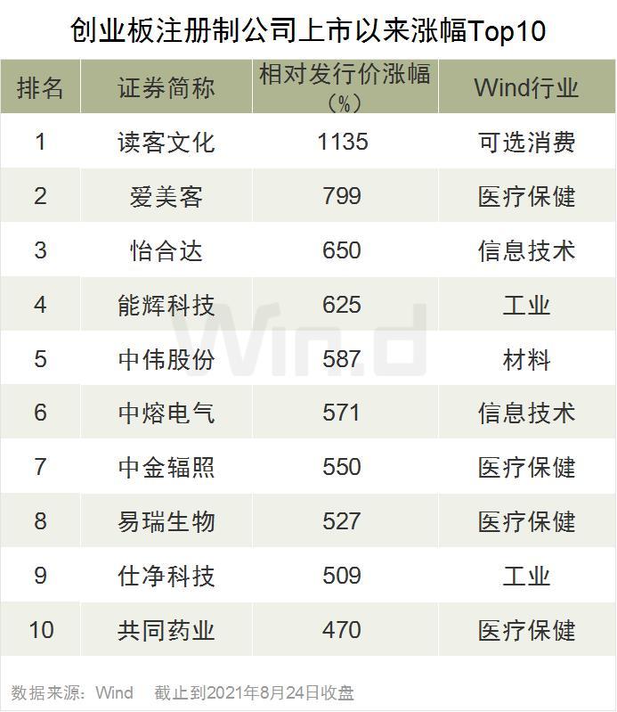 184家注册制下新上市公司中,截止8月24日收盘,读客文化相对发行价累计上涨超过11倍,位居首位,爱美客、怡合达位居二三位。