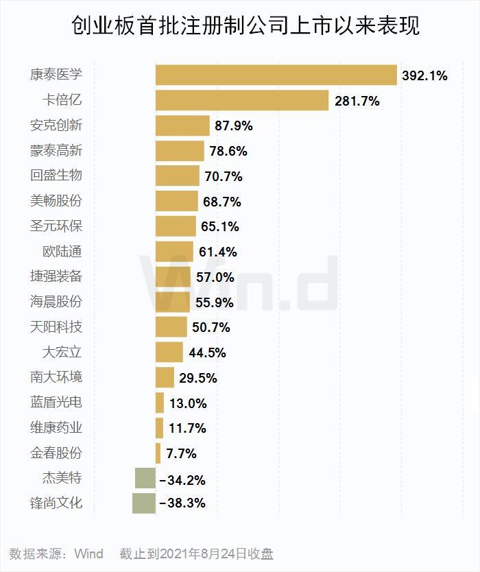 从首批18家创业板注册制公司一年以来涨跌幅看,康泰医学相对发行价涨幅达392.1%,位居首位。