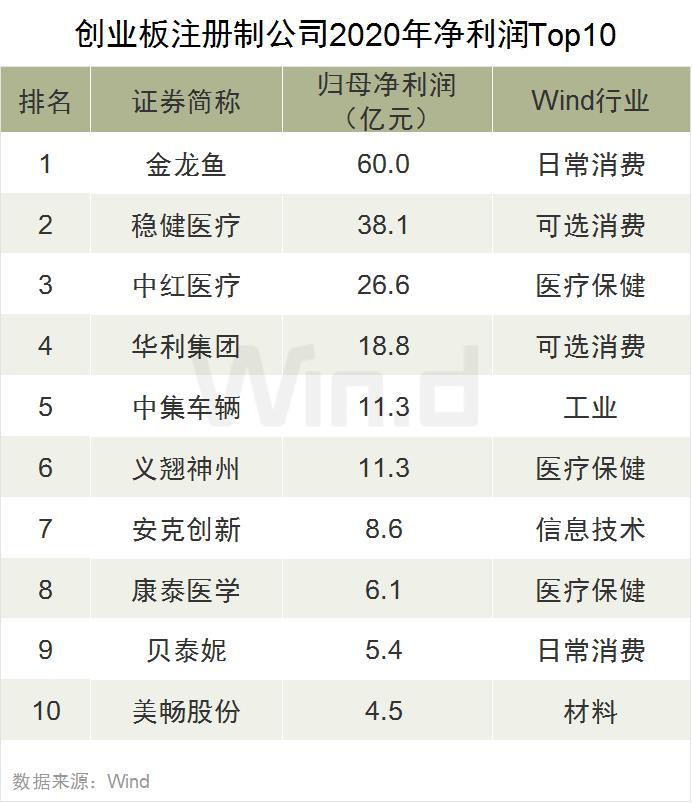 从2020年年报归母净利润来看,184家注册制下新上市公司合计实现净利润386.27亿元,平均单家公司净利润为2.1亿元,金龙鱼净利润达60亿元,位居榜首。