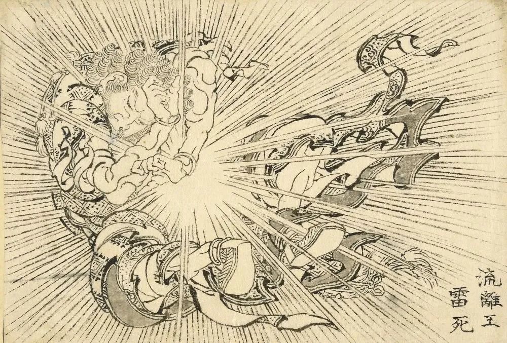 葛饰北斋,《Virudhaka (Ruriō) 被闪电杀死》 (The Great Picture Book of Everything)。纸本水墨,1820-40 年代。购买由 Theresia Gerda Buch Bequest 资助,以纪念她的父母 Rudolph 和 Julie Buch,并得到艺术基金的支持。