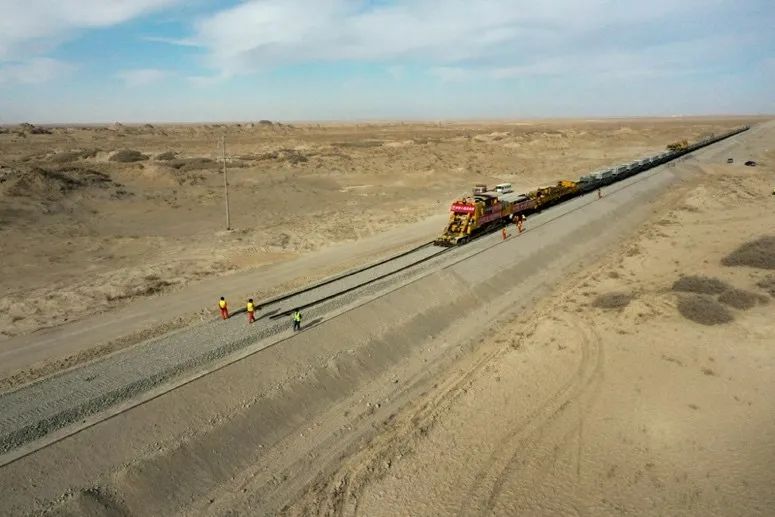 2021年2月2日,新疆和若铁路铺轨现场。图源:阿曼|新华社68年前,王震将军出任铁道兵第一任司令员时,毛主席曾对他说:我们将来还要把铁路修到新疆,围着塔里木转一个圈子。