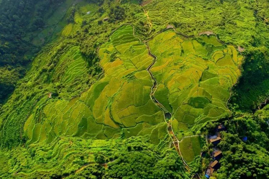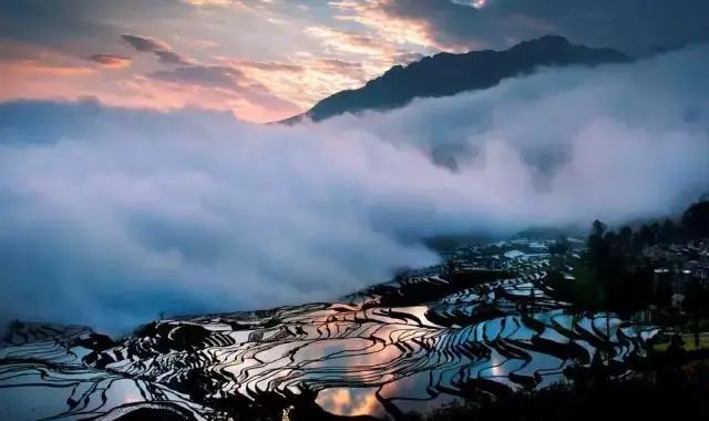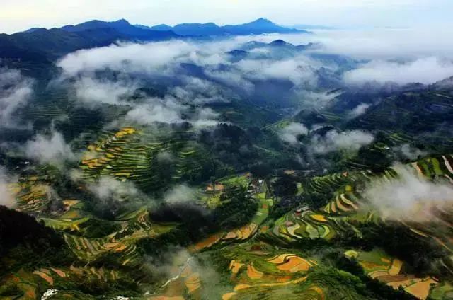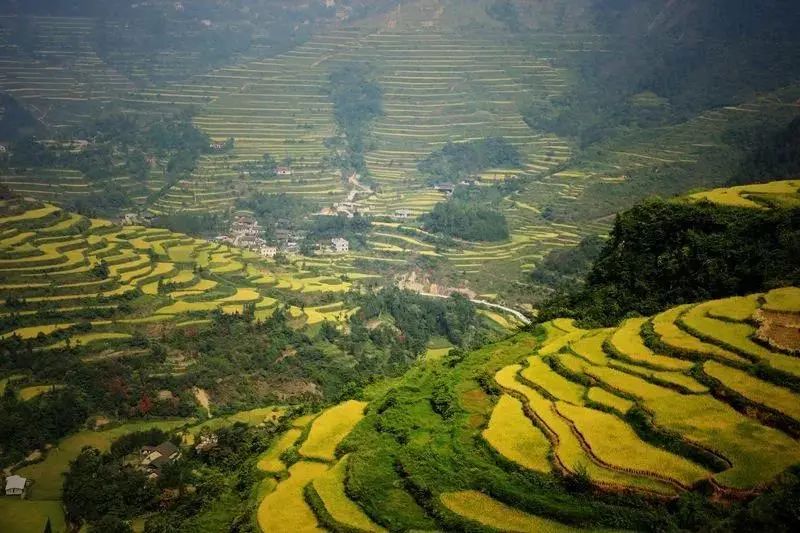 层层梯田在各个季节,有不同的景观,春天水汪汪的梯田,在夕阳映照下,犹如一面面发光的平镜,在夏天却是绿浪翻滚,在秋天更为美丽壮观,成熟的稻田一片金灿灿,好似铺满黄金一般。