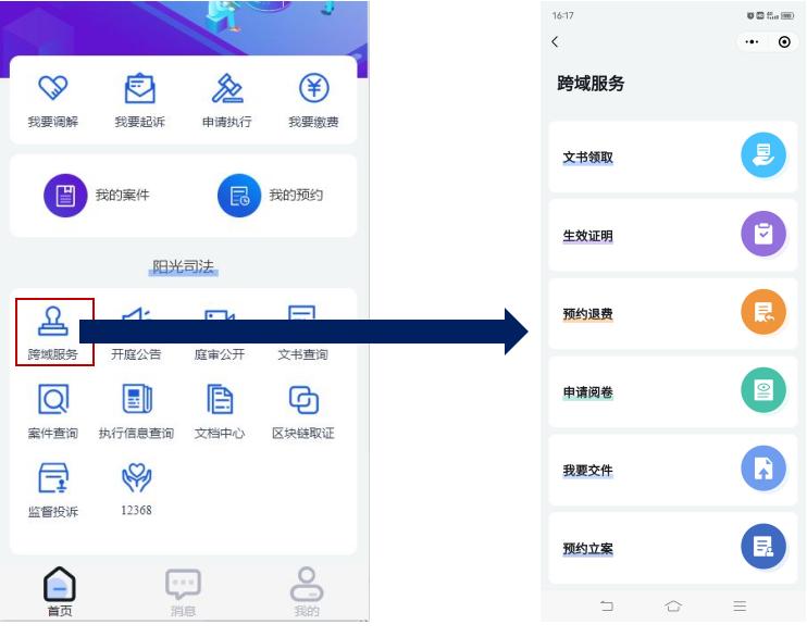 查询案件进度、预约办事、申请退费、提交电子材料、申请电子阅卷、区块链存证等业务