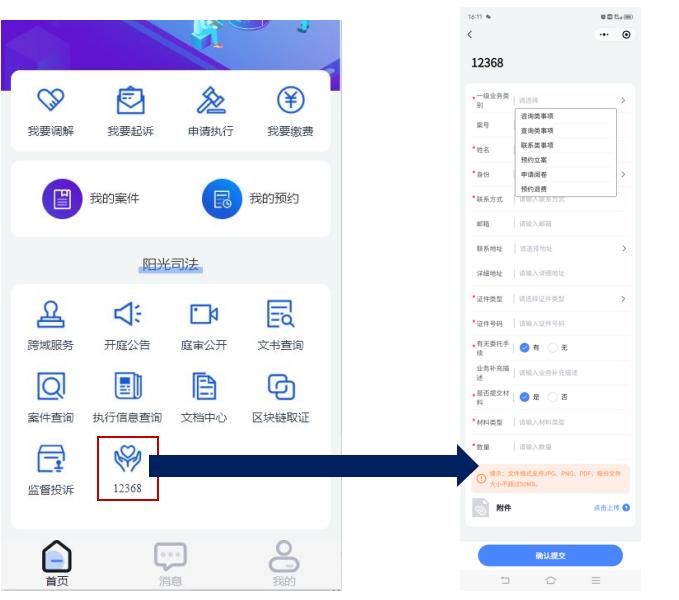 小程序为当事人、代理人提供了文书领取、开启生效证明、预约退费、申请电子阅卷、提交电子材料、预约立案等“跨域”诉讼服务功能,当事人、代理人填写工单后,中院跨域诉讼中心将进行审核收件,在完成具体工作后,通过电话、小程序、短信告知申请人办理结果。二、12368网上诉讼服务
