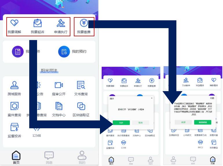 对最高法院、省法院统一建设的小程序,我们将在小程序上设立访问快捷方式,当事人、代理人无需搜索,从小程序即可直接跳转访问。对尚不能使用小程序访问的应用,我们采取引导提示方式,当事人复制平台地址后使用手机浏览器直接访问。“让数据多跑路,让群众少跑腿”