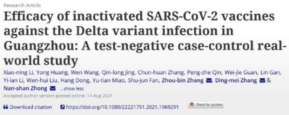 接种疫苗有多必要?钟南山团队等最新研究!国产新冠疫苗应对Delta亚株真实世界研究正式发表,广州市疾病预防控制中心联合中国工程院院士钟南山团队以及中山大学公共卫生学院张定梅副教授团队,以广州市今年5月至6月新冠疫情中的病例及密切接触者为研究对象,通过检测—阴性设计的病例对照研究,估算出中国国产新冠病毒疫苗应对Delta变异株的保护效果。