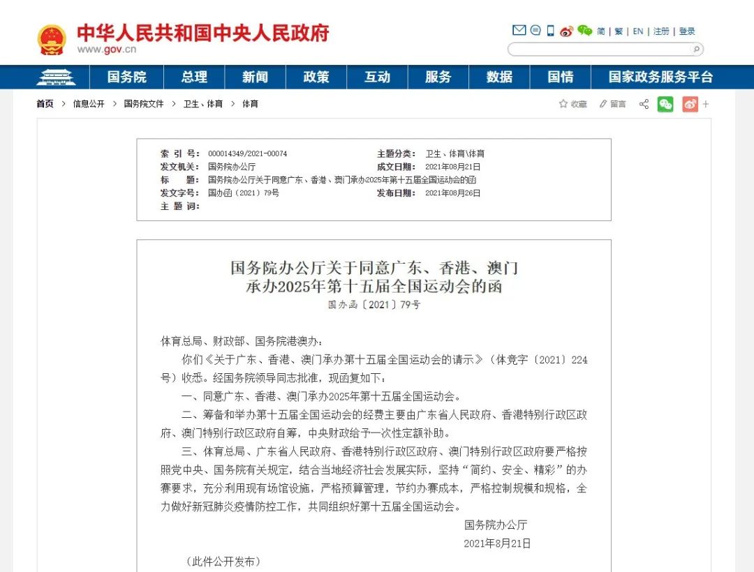 8月26日,中国政府网发布《国务院办公厅关于同意广东、香港、澳门承办2025年第十五届全国运动会的函》,具体内容如下: